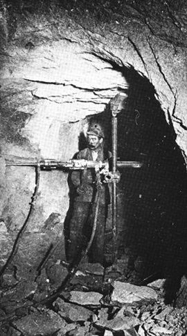Otto Larsson (Hagen) vid pelarborrmaskin på 140 m djup i Skottvångs gruva. Foto: A. Bianchini.